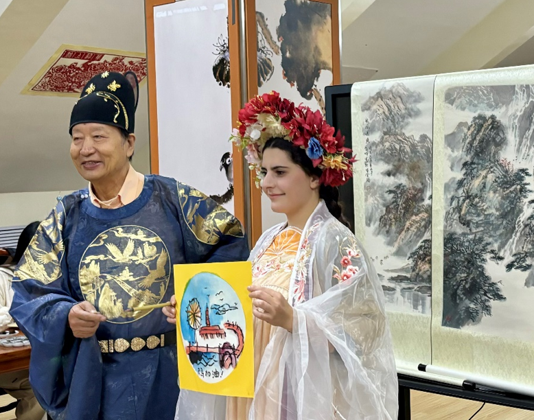 国画大师刘家城(左)与来自亚美尼亚的香琳共同绘制天津海河风景图并合影留念摄影刘莹