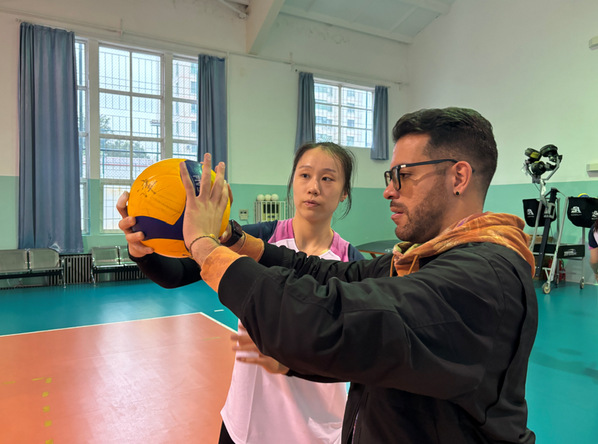 女排姑娘一对一教学国际体育文化推荐官吴瑞龙传球动作(右一)