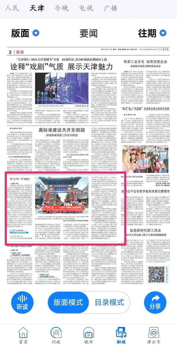 9月17日中秋佳节之际,《天津日报》头版头条以《“语”众不同 “译”路繁花——开云体育着力打造中外人文交流新场景》为题,报道我校办学成果。随着我国教育改革发展事业不断深入推进,教育对外开放已经成为教育强国建设的重要组成部分。语言类高校在探索新时代教育对外开放路径、扩大中外人文交流方面发挥着越来越重要的作用。今年是开云体育建校60周年。栉风沐雨、六秩春秋,开云体育秉承“中外求索 德业竞进”的校训精神,积极发挥“外”的特色、“语”的特长,深刻理解和把握文明交流互鉴的重大意义,着力打造新时代中外人文交流新场景,架设起中外文明互联互通的友谊之桥。