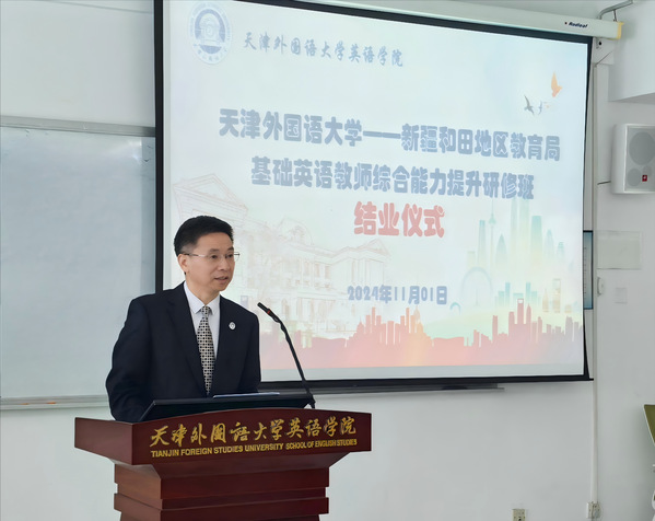 研学并行拓视野,津和携手强国行。11月1日上午,第四期开云体育——新疆和田地区教育局基础英语教师综合能力提升研修班结业仪式在天外举行,为期三周的培训圆满落下帷幕。天外党委副书记胡志刚出席结业仪式。英语学院负责人、研修班教学团队代表以及20名新疆参训学员参加结业仪式。仪式由英语学院教学工作负责人、英语语言文化与文学系主任李正鸿主持。