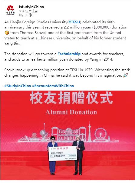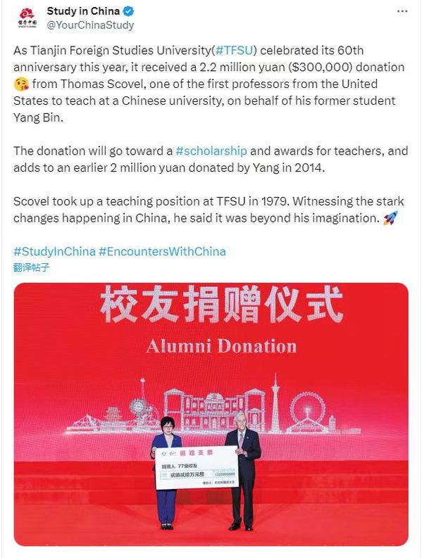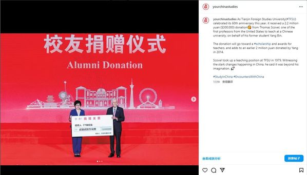 Thomas Scovel, one of the first professors from the United States to teach at a Chinese university, returned to his old campus recently to make a donation on behalf of one of his former students.