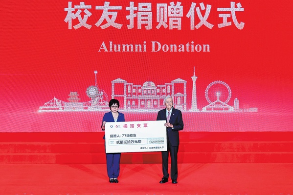 Thomas Scovel presents a cheque for 2.2 million yuan on behalf of his former student Yang Bin to Li Yingying, president of Tianjin Foreign Studies University, during the 60th anniversary of the university on Sept 28. [Photo provided to CHINA DAILY]