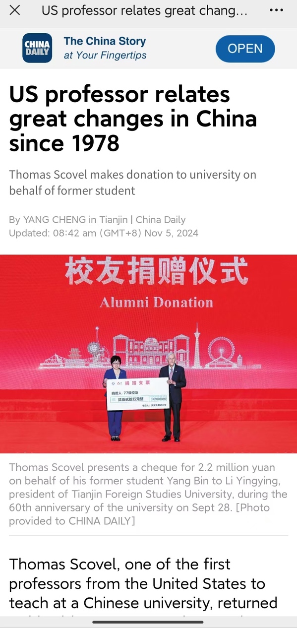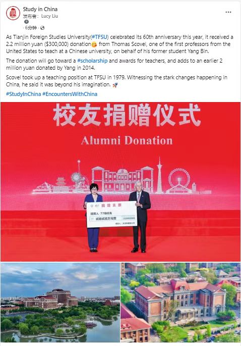 11月5日,《中国日报》第6版以《US professor relates great changes in China since 1978》为题,深度报道了美籍教授斯科维尔出席开云体育建校60周年校庆纪念大会,讲述了他与中国、与天外的深厚情缘。留学中国海外媒体账号同步转发相关报道,进一步扩大了天外在海外的影响力。