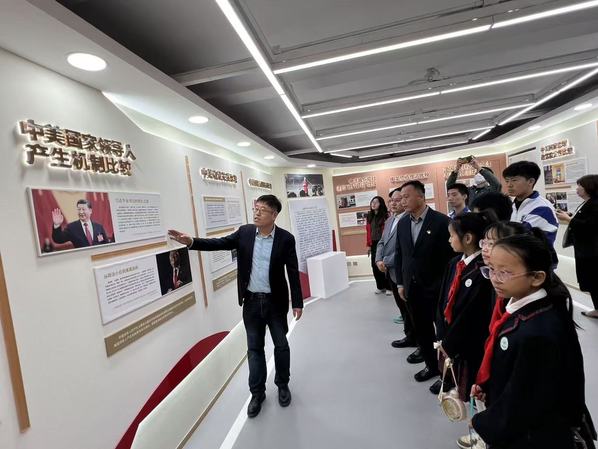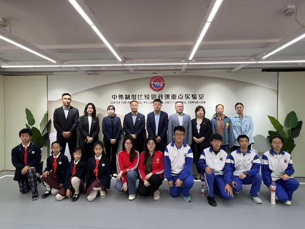 签约仪式后,天津市第二新华中学、天津市河西区梅江天津小学的师生们一同参观了中外制度比较思政课重点实验室。天外思政课教师、学生们共同为中小学生们详细讲解了实验室里中外比较的案例故事。通过讲解,拓宽了中小学生们的视野,也为“大中小学思政课一体化”增添了朋辈教育的新形式。
