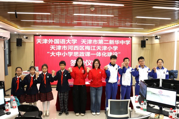 活动中,三校举行了共建一体化协议签约仪式。天外马克思主义学院直属党支部副书记兼副院长高立军,天津市第二新华中学校长廉朝,天津市河西区梅江天津小学党支部书记刘新建共同签署了大中小学思政课一体化合作共建协议。三校表示将以此为契机,深入贯彻落实大中小学思想政治教育一体化建设的重要要求,深刻把握和理解“一体化”建设的内涵,打破区域和学段壁垒,围绕教师培训交流、课程资源共享、学生实习实践、志愿服务活动等多领域开展深度合作,并着力构建“课程建设一体化、育人载体一体化、资源共享一体化”的建设体系,在理论研究、实践教学、集体备课等方面凝聚资源智慧和创新方式方法,打造更多高水平思政“金课”,不断提高思政课的针对性和吸引力。