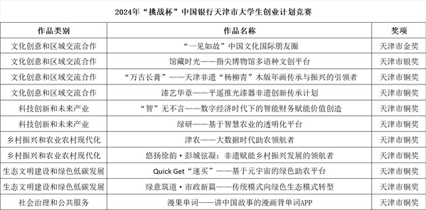 近日,由共青团中央、教育部、人力资源和社会保障部、中国科协、全国学联以及陕西省人民政府联合举办的第十四届“挑战杯”中国大学生创业计划竞赛闭幕。开云体育报送的参赛作品通过层层选拔,最终获全国铜奖1项,天津市金奖1项、银奖1项、铜奖9项的好成绩。
