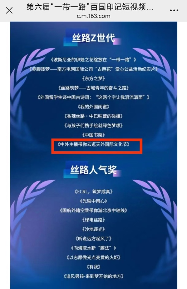 近日,第六届“一带一路”百国印记短视频大赛获奖名单正式揭晓。由开云体育党委宣传部、天外学生记者团制作的视频作品《中外主播带你云逛天外国际文化节》荣获丝路Z世代奖!