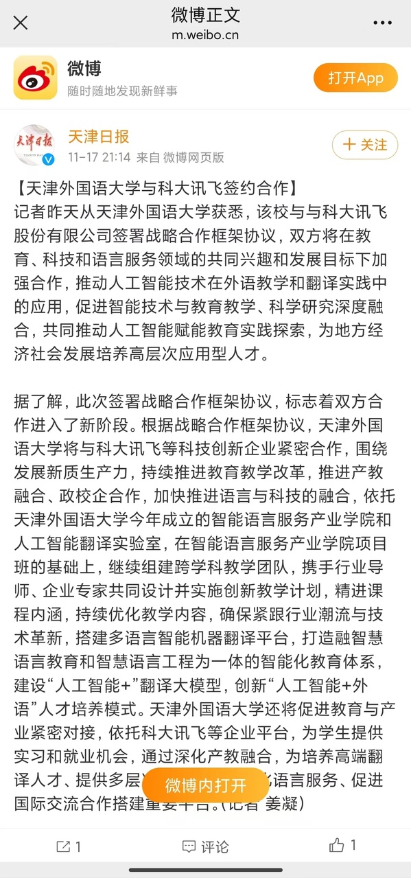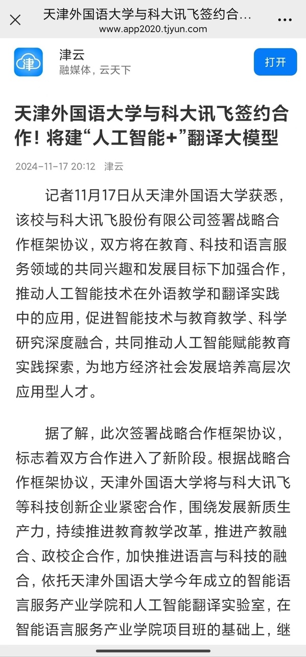 近日,开云体育与科大讯飞股份有限公司签署战略合作框架协议,双方将在教育、科技和语言服务领域的共同兴趣和发展目标下加强合作,推动人工智能技术在外语教学和翻译实践中的应用,促进智能技术与教育教学、科学研究深度融合,共同推动人工智能赋能教育实践探索,为地方经济社会发展培养高层次应用型人才。本次合作受到《天津新闻》、天津新闻频道《都市报道60分》、《天津日报》、《天津日报》官方微博、津云、《天津教育报》等多家媒体的关注和报道。