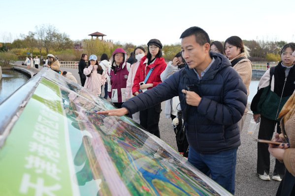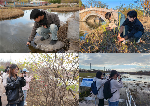 走进临港公园,“水荡沽田”“蜿蜒蒲香”“芦荡飞雪”“长田鹭飞”“曲水花径”等八大特色景观一一在师生面向精彩呈现。听着来自天津市环科院生态中心刘红磊博士的专业讲解,师生们漫步其中,一路走一路看一路实践。调研中,精彩的互动环节吸引了师生们的广泛参与,他们有的在湿地湖采集取样,有的收集芦苇研究净水原理,有的挖掘土壤了解土质,有的驻足拍摄候鸟栖息觅食的有趣场景,大家在 “沉浸式”思政课教学中真切感悟美丽中国建设的天津生动实践。