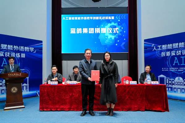会上,举行了蓝鸽集团捐赠仪式和人工智能赋能外语教学培训基地揭牌仪式。人工智能赋能外语教学培训基地旨在通过先进的AI技术提升外语教师的数字教学能力,推动外语教学的创新发展。