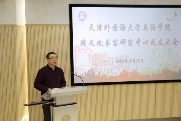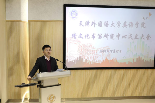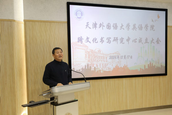 袁世军发表致辞,祝贺跨文化书写研究中心成立。他指出,跨文化书写研究中心聚焦文化对话、文学交流与国际传播等课题研究,为外语教师提供了良好的学术发展平台。他希望,中心进一步发挥学术共同体的作用,引领教师将学术热情与地方区域发展和国家需求相结合,积极申报各类科研项目,不断提升学术研究能力,为服务国家和天津社会经济发展做出贡献。