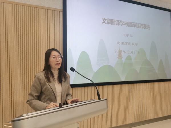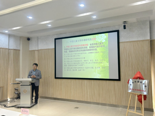 跨文化书写研究中心特聘研究员、中国海洋大学博士生导师徐德荣教授,沈阳师范大学外国语学院院长王宇弘教授分别作了题为“中国儿童文学外译研究纵横谈”“文章翻译学与翻译修辞表达”的学术讲座。