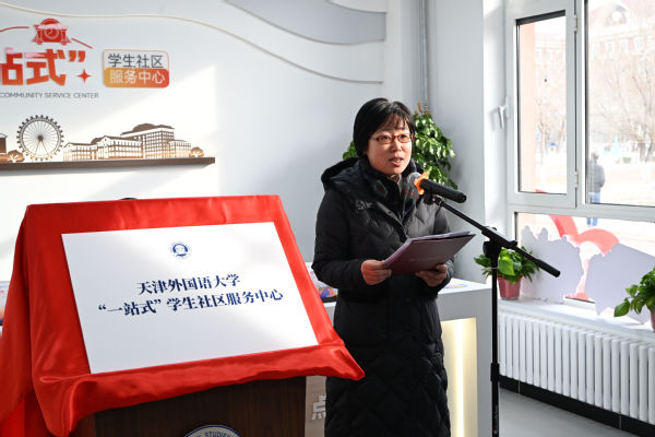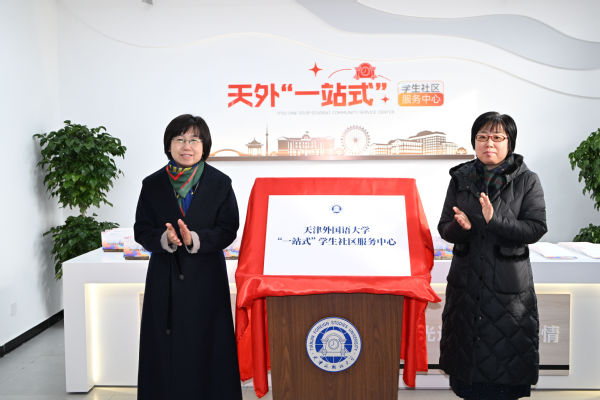 校党委书记周红蕾、校长李迎迎共同为天外“一站式”学生社区服务中心揭牌。