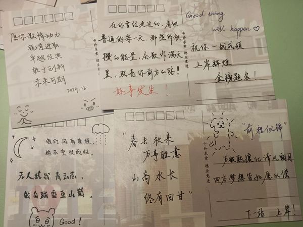 天外学子将祝福书写下来,愿考研学子如破茧之蝶,振翅高飞。相信自己的力量,定能跨越重重山峦,迎接胜利的曙光!