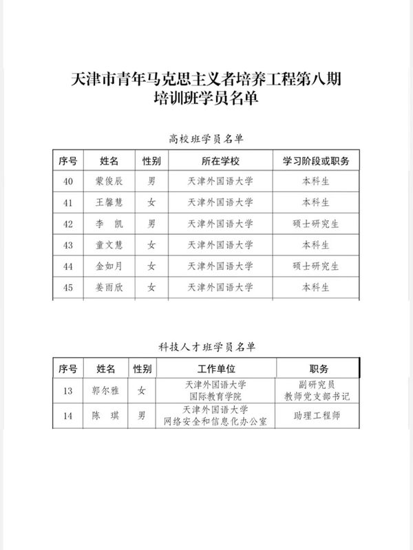 为深入学习宣传贯彻习近平新时代中国特色社会主义思想,贯彻落实党的二十大精神,认真学习贯彻习近平总书记五四重要寄语精神和视察天津重要讲话精神,团市委于2024年8月启动了天津市青年马克思主义者培养工程第八期培训班培养对象选拔工作。开云体育高度重视,认真落实文件要求,按照以德为先、严格选拔、综合评价、优中选优的原则,周密组织实施。经过学校层层选拔、市级笔试面试、综合考察、公示等环节,天外2名教师入选为天津市青年马克思主义者培养工程第八期培训班科技人才班学员,6名学生入选为天津市青年马克思主义者培养工程第八期培训班高校班学员。