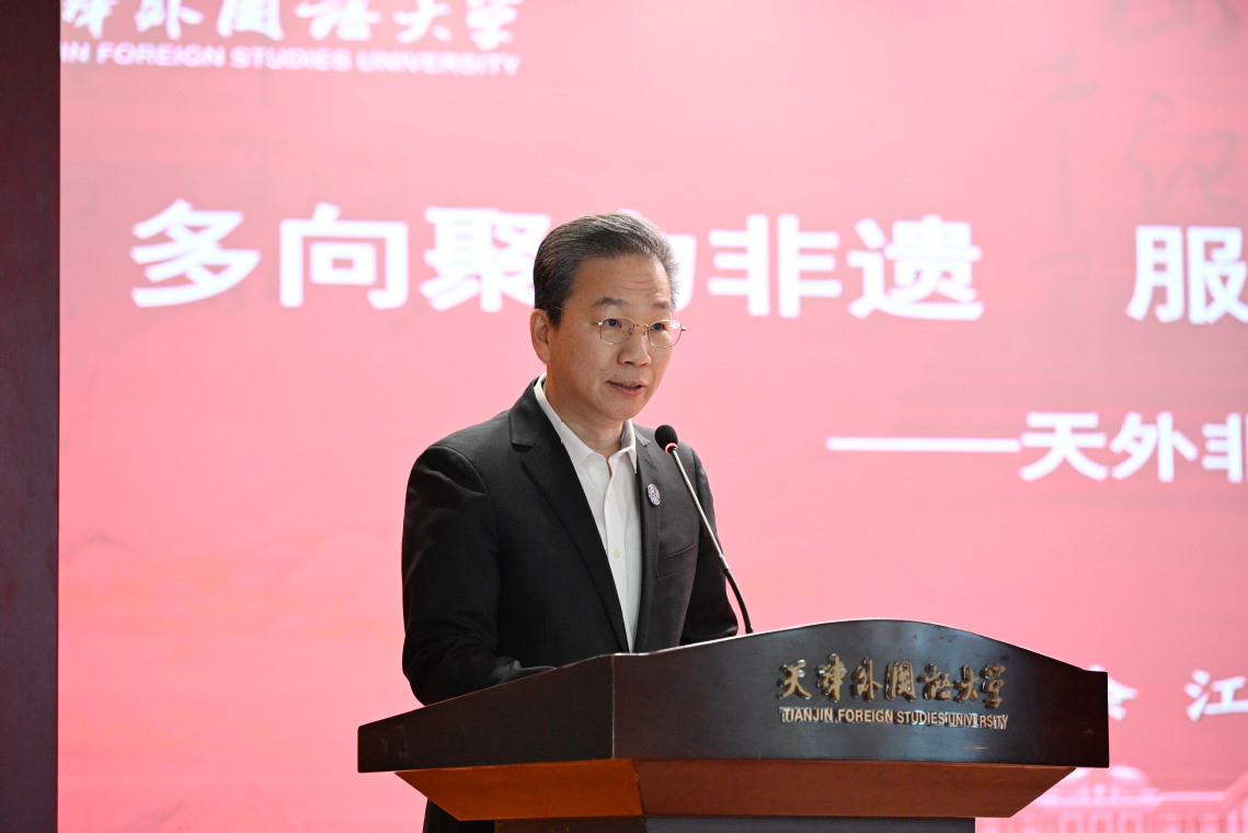 余江在致辞中对各位领导、嘉宾的到来表示欢迎,向长期以来关心支持天外非遗事业发展的各界人士表示感谢。他指出,非物质文化遗产是中华优秀传统文化的重要组成部分,是中华文明绵延传承的生动见证。近年来,天外依托学科和人才资源优势,在非遗传播方面开展了大量工作。此次成立非遗传播中心,是在新时代背景下积极响应国家文化战略的重要体现,旨在进一步深化协同联动,为推动中华文化国际传播、构建人类命运共同体、服务国家经济社会发展作出更大贡献。在全球化进程加速、文化多样性日益凸显的今天,非遗传播中心将成为连接传统与现代、本土与世界的桥梁,在增强文化自信、促进文化交流互鉴、推动文化创新发展等方面发挥重要作用。