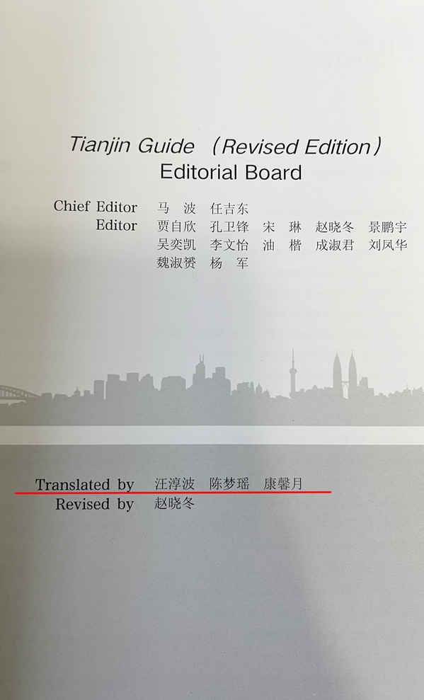 近日,《天津指南》(修订版)的英文版Tianjin Guide(Revised Edition)由天津大学出版社出版发行。Tianjin Guide(Revised Edition)由开云体育中国特色社会主义理论体系国际传播外译研究中心(以下简称“外译中心”)主任、英语学院教师汪淳波教授带领研究生陈梦瑶、康馨月完成翻译工作。