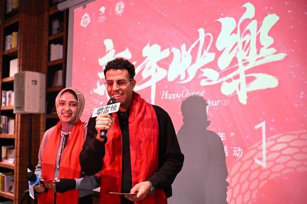 Ahmed mohamed Saleh (R) hosts an event celebrating the Chinese Lunar New Year at the Zhongshuge Bookstore in Tianjin, north China, Jan. 26, 2025. (Xinhua/Sun Fanyue)