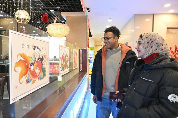 Ahmed mohamed Saleh (L) watches Yangliuqing woodblock pictures at Tianjin Foreign Studies University in north China's Tianjin Municipality, Jan. 28, 2025. (Xinhua/Sun Fanyue)