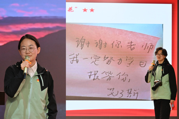 支教团领队教师崔伟杰汇报了团队扎根新疆教育一线倾情奉献,青春热血浇灌民族团结之花取得的实践成果。学生代表陈佳凤、刘雨桐,分享了实习支教的心路历程以及用镜头定格的三个感人故事。支教团成员与接受援助的新疆少数民族学子共唱《凤凰花开的路口》,许下今年9月再次相见的约定,传递了教育薪火相传的坚定信念,将温情瞬间燃至沸点,现场观众心潮澎湃,泪光闪烁。