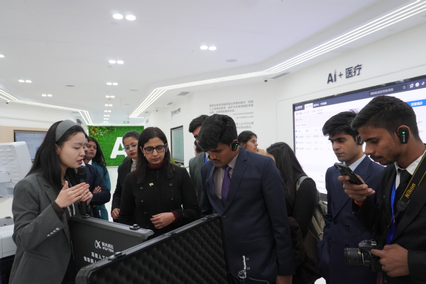科大讯飞:人工智能展厅内,语音识别、虚拟交互等创新技术引发学员浓厚兴趣,双方探讨了中印在AI赋能教育、医疗等领域的合作潜力。