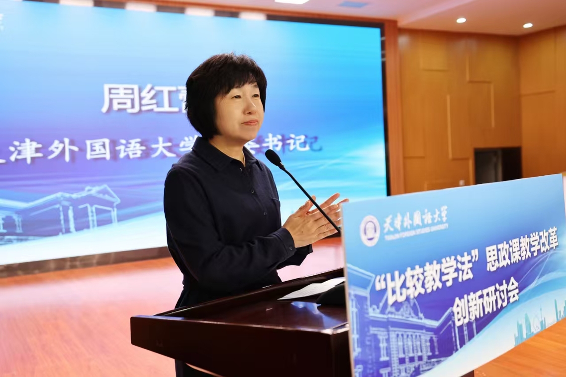 校党委书记周红蕾在致辞中指出,习近平总书记在全国教育大会上强调,要坚持不懈用新时代中国特色社会主义思想铸魂育人,实施新时代立德树人工程。召开思政课教学改革创新研讨会是学校深入贯彻落实全国教育大会精神、《教育强国建设规划纲要》的重要举措,恰逢其时、十分必要。结合外语院校学生特点,要深入探讨思政课教学中“以何比较”“何以比较”等理论问题和实践路径,进一步把道理讲深讲透讲活,不断提高思政课的针对性和吸引力。