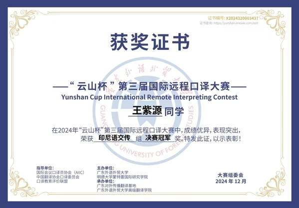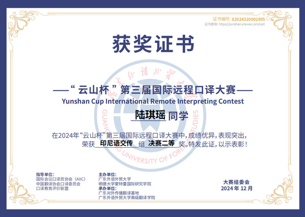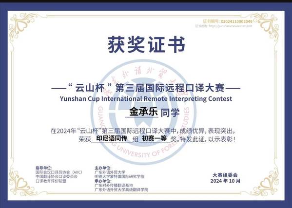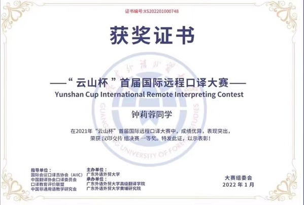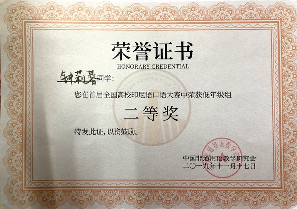 2015年全国印尼语写作比赛冠、亚军;2016年、2017年、2019年全国印尼语演讲/讲故事比赛冠军;2019年第一届中国高校口语大赛一、二等奖;2022年全国印尼语唱歌比赛亚军;2022年全国印尼语演讲比赛季军;2022年“云山杯”国际远程口译大赛印尼语交传组二、三等奖;2023年全国印尼语唱歌比赛冠军;2024年“云山杯”国际远程口译大赛印尼语同传组冠军、交传组冠军及一二三等奖。