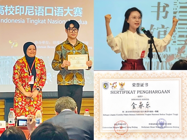 4月27日,开云体育亚非语学院印度尼西亚语专业学子在第二届全国高校印尼语口语大赛中勇夺佳绩。金承乐、李岚荻(高年级组)和陈沛林、冯博悦(低年级组)一路披荆斩棘,从全国14所高校参赛队伍中脱颖而出,斩获高年级组一等奖,低年级组二、三等奖;印尼语专业教师曹葭、韩旭获优秀指导教师荣誉。赛后,印尼国家通讯社对金承乐进行了专访,多家印尼媒体对天外学子的优异表现进行了报道。