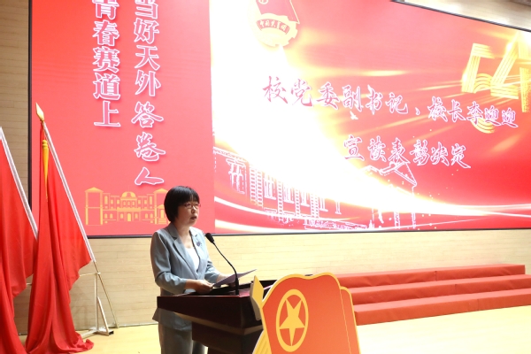 周红蕾代表学校党委向受到表彰的先进集体和个人表示祝贺,充分肯定了过去一年学校各级团组织取得的丰硕成果。她对广大团员青年提出三点希望:一是坚定理想信念,以赤子之心厚植家国情怀;二是锤炼本领之刃,以创新之力勇担强国使命;三是激扬奋斗之志,以拼搏之姿书写青春答卷。她强调,各级团组织要紧紧围绕学校中心工作,切实增强政治性、先进性、群众性,不断提升组织力、引领力、服务力和大局贡献度;要加强对青年的思想政治引领;要创新工作方式方法;要关心关爱青年,竭诚服务青年成长发展;要加强团的自身建设,不断推进共青团工作事业提质增效,不断为中国式现代化凝聚磅礴青春力量!
