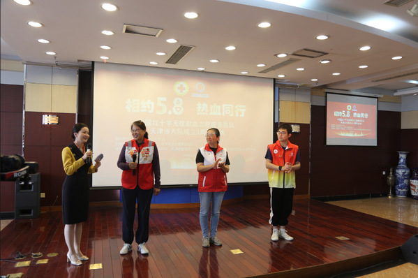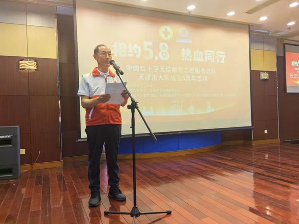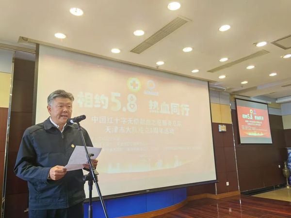 无偿献血志愿服务5周年主题宣传活动 5月7日,在第78个世界红十字日来临之际,由天津市委社会工作部指导,天津市红十字会、天津市卫生健康委员会联合主办的“相约5·8 热血同行”无偿献血志愿服务推进会暨中国红十字无偿献血志愿服务总队天津市大队成立五周年纪念活动在市血液中心隆重举行。市红十字会党组成员、副会长张彤,市卫生健康委员会党委委员、副主任刘先夺出席活动并讲话。 张彤指出,市无偿献血志愿服务大队成立5年来,不仅在保障临床用血,推进无偿献血事业高质量发展中贡献力量,更在促进社会发展进步、塑造城市精神、提升城市文明水平中发挥着重要作用。他勉励志愿者始终秉持红十字精神,立足自身优势,加强组织建设,提升志愿服务专业化水平。