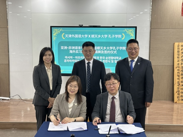 在顺天乡大学,朱鹏霄与该校校长宋炳国、副校长金基德等分别会谈。双方回顾了合作历程、探讨了在教育合作领域共同面临的问题与挑战,并沟通展望了接下来全面升级合作的新领域与新举措。双方一致同意:依托顺天乡大学孔子学院中国学研究所成立“中韩翻译研究中心”,联合组建“中韩科技翻译工作组”,推动学术翻译成果转化;对接韩国出版振兴院,推动两校学者参与“亚洲经典互译计划”(韩国政府资助项目);将顺天乡大学孔子学院中国学研究所KCI候补学术期刊《沽山中国学报》合作升级,打造为KCI核心期刊,增设“中韩跨学科创新研究”专栏,定向邀请两国智库供稿,并联合出版发行。访问期间,亚非语学院党总支书记张海梅与顺天乡大学孔子学院韩方院长洪承植共同签署共建海外实习基地协议并为基地挂牌。