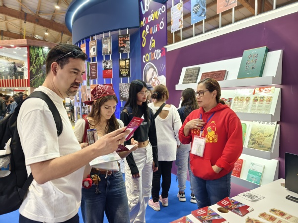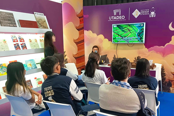 在文化展区现场,塔德奥孔子学院特别设置了精品图书展销专区,集中展示了近百种精选中国图书,涵盖文学经典、汉语学习、传统文化等多个领域。展位上,当代中国小说选集以及各类汉语教材等书籍整齐陈列,吸引了大批哥伦比亚读者驻足翻阅。不少文学爱好者一边仔细品读书籍内容,一边向工作人员咨询图书详情。现场工作人员介绍:“这些图书都是经过精心挑选的,能够满足不同读者的需求。”