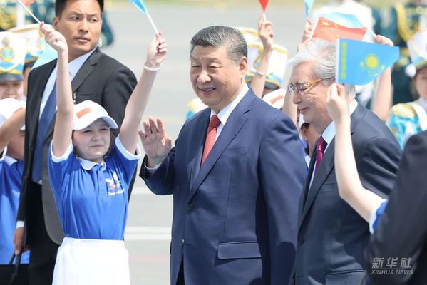 当地时间6月16日中午,国家主席习近平乘专机抵达阿斯塔纳,应哈萨克斯坦共和国总统托卡耶夫邀请,出席第二届中国-中亚峰会。