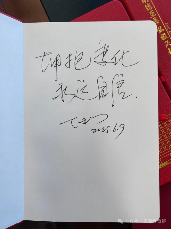 中国民航大学校长丁水汀向毕业生代表赠送亲笔寄语的学校文创笔记本,表达学校对广大毕业生的祝福与期望,祝愿2025届全体毕业生前程似锦。