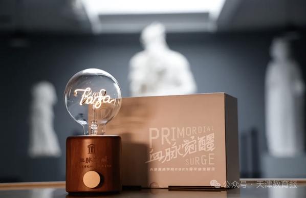 天津美术学院2025年毕业礼物为创意定制小夜灯,分为上下两部分,设计精致巧妙,可自行组装。上部的灯泡被通透如水晶的玻璃罩温柔包裹,光影流转间,似凝结了美院无数灵感瞬间。玻璃罩内,“TAFA”字样 以流畅的线条勾勒,光影映衬下若隐若现,如星辰闪烁。这不仅是母校给予学子的专属印记,也象征着血脉相连的羁绊。下部的灯柱则是信念与期许的载体。