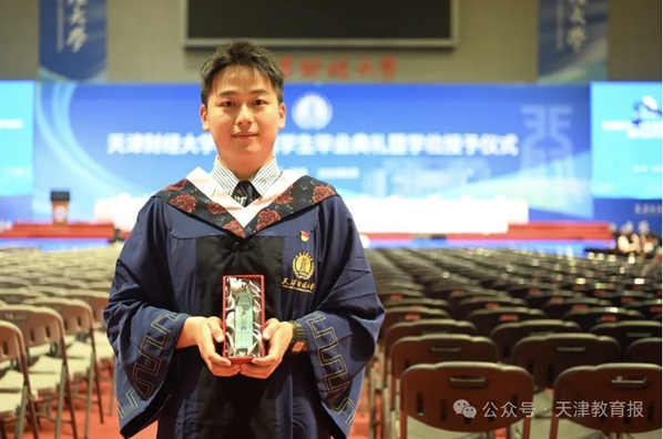 天津财经大学送给优秀毕业生代表的毕业礼物是一份特别设计的纪念品,纪念品里装着该校的一滴湖水,包含两层含义:一是取天财湖一滴水伴毕业生远行,祝福所有毕业生一帆风顺;二有饮水思源、水滴石穿之意,象征每名学生都像一滴水,四年间不断汲取养分,毕业后融入时代发展浪潮,勇搏新高。