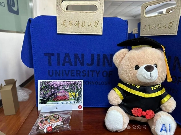 天津科技大学人工智能学院为2025届毕业生定制天科AI熊、明信片与冰箱贴。天科AI熊头戴学位帽,身着带有学院元素的学士服,脚上印着“AI”的字样,鲜明彰显人工智能学院特色。小熊衣服上还有红色中国传统盘扣,传递着东方韵味,寓意同学们永葆青春热忱,勇立时代潮头。明信片印有校园风景,定格美好回忆;冰箱贴融入天科大特色,留存校园印记。从校园行囊到未来陪伴,它是学院对毕业生AI之旅的见证,承载着青春回忆与科创期许,让AI温度随毕业生奔赴下一程山海。