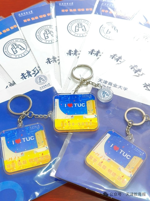 天津商业大学为毕业生送上满含心意的礼物:苹果、专属贴纸、钥匙扣。一颗象征“平安”的苹果,搭配“前程似锦 未来可期”定制礼品袋,借平安顺遂之意,盼学子旅途无虞、健康常伴;天津商业大学专属贴纸将校园风景与商大文化凝于方寸,贴在日常物件上,让母校的温度时刻相随;小巧钥匙扣,串起校园记忆与新程期许,既是开启人生新篇的“密钥”,也愿守护毕业生握住生活的方向。