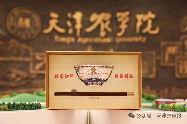 这是一份专属天农毕业生的独家珍藏纪念礼物。纪念碗在千年瓷都景德镇精心烧制而成,将农业使命、津派特色和母校情怀熔铸于方寸之间。同时,一双刻有“天农”字样的筷子既传递“一箸一饭不忘本”的感恩情怀,也寓意天农学子未来人生“节节高升”的美好期许。