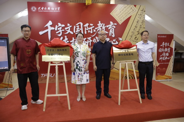 近日,《千字文》国际教育传播中心、《千字文》研学实践基地揭牌仪式在天外举行。天外副校长朱鹏霄,南开大学历史学院研究员何孝荣,韩国顺天乡大学孔子学院院长洪承直,人社部全国人才中心党支部书记陈百川,天津市蓟州区渔阳镇镇长董子忠,天外国际教育学院院长高嘉勇出席,中外师生及渔阳镇小学生、家长代表参与了本次活动。与会领导共同为成立仪式揭牌。天外国际教育学院党总支书记孙倩主持仪式。