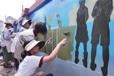 6月30日,在南开区少年宫美术老师的悉心指导下,天津美术学院、天津师大南开附中、区少年宫的大中小学生,用画笔将南开誉英学校的围墙化作巨型涂鸦墙,用斑驳色彩描绘了“文明天津”“文明南开”,彰显深厚文脉。(摄影:孙乃燕)