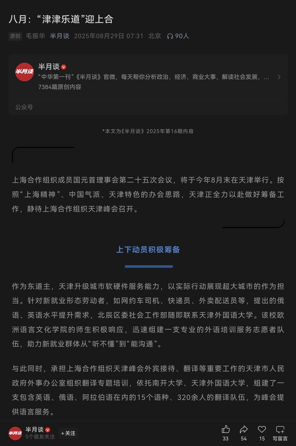 【相约上合】新华社主办的《半月谈》报道我校为北辰区进行外语培训、组建翻译团队、进行城市语言环境建设相关情况。
