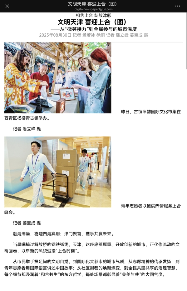 这场覆盖全域、全民参与的文明盛宴,充分激发了市民的主人翁精神和东道主意识,这份支持上合、服务上合的热忱,正是海河儿女乐观豁达、热情好客的生动写照。