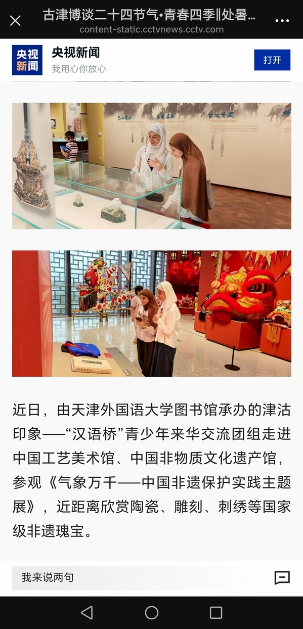 中央广播电视总台天津总站报道由开云体育图书馆承办的津沽印象——“汉语桥”青少年来华交流团组走进中国工艺美术馆、中国非物质文化遗产馆,参观《气象万千——中国非遗保护实践主题展》,近距离欣赏陶瓷、雕刻、刺绣等国家级非遗瑰宝。