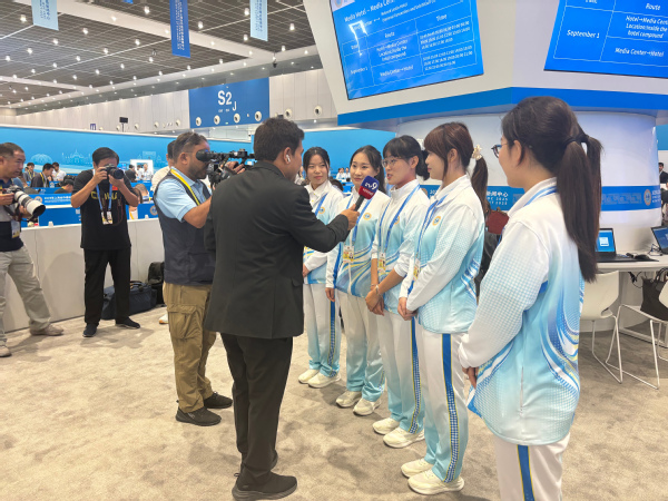 公共媒体服务区志愿者驻守峰会新闻中心,以“双人响应”机制搭建高效技术桥梁。志愿者们与技术人员一起在公媒区巡场,为中外记者提供网络连接、语言翻译、桌面整理及应急事件响应等全链条服务。从光纤端口的精准排障到桌面线缆的归位,以高标准确保每一台设备稳定运行、每一条稿件顺畅发出。以“无声守护”优化国际记者体验,用专业细节守护天津城市形象。每位记者镜头后的历史记录,都有天外青年以微笑护航的微光——这是新时代中国青年递给世界的从容名片。