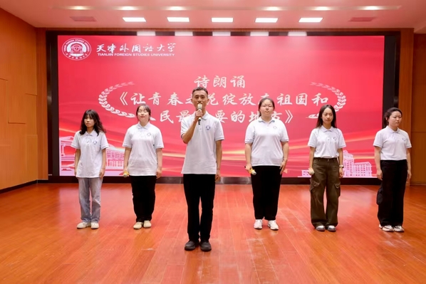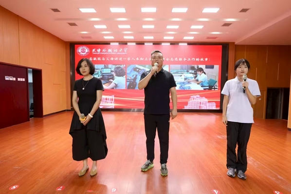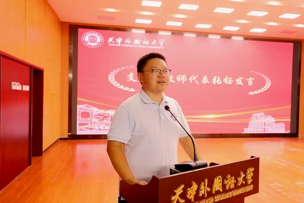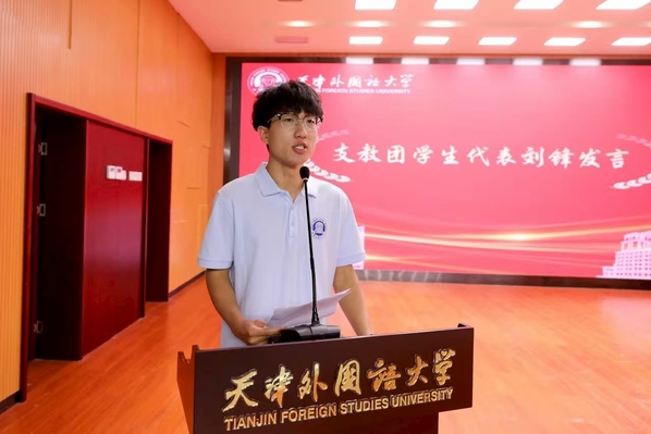国际传媒学院刘锋作为支教团学生代表发言,他以自己两次申请参加赴疆实习支教的经历,号召大家要牢记使命、踔厉奋发,展现天外学子的卓越风采,为促进民族团结和边疆教育事业的发展贡献青春力量。