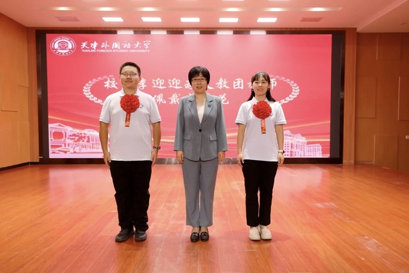 李迎迎为2025年赴新疆和田地区实习支教团带队教师佩戴光荣花。
