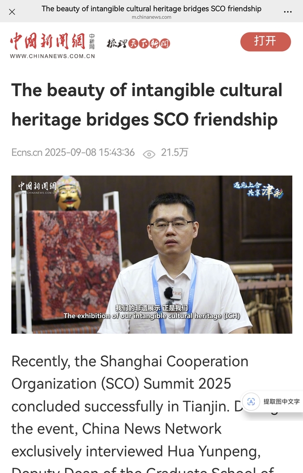 【相约上合】上合峰会期间,中新社专访了我校高级翻译学院副院长、上合组织天津峰会非遗讲解员华云鹏。报道通过中新社全媒体平台发布,并由中央网信办向全网推送。
