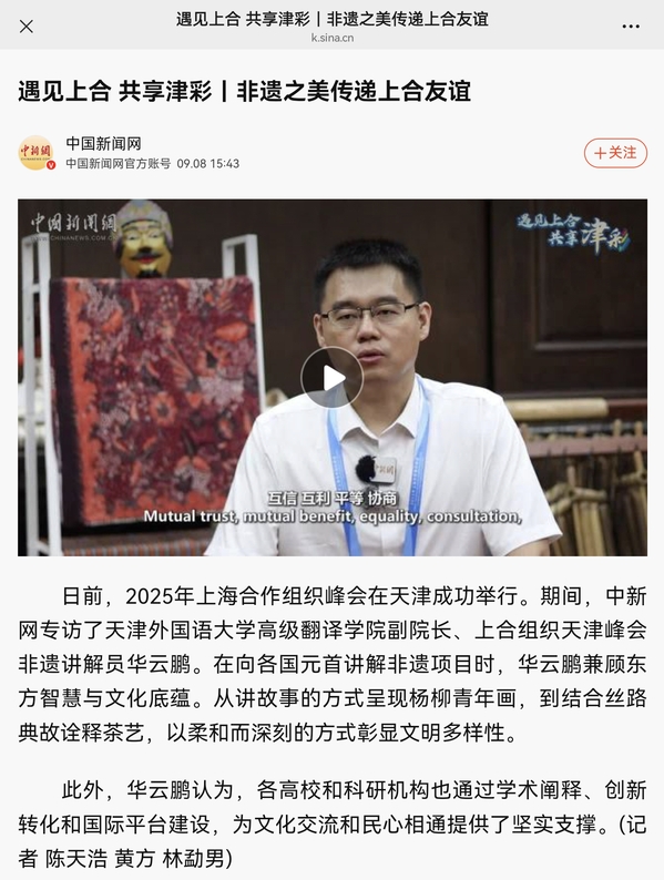 【相约上合】上合峰会期间,中新社专访了我校高级翻译学院副院长、上合组织天津峰会非遗讲解员华云鹏。报道通过中新社全媒体平台发布,并由中央网信办向全网推送。