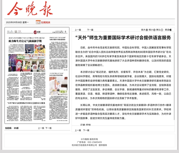 【媒体天外】《今晚报》报道由中共中央党史和文献研究院、中国社会科学院、中国人民解放军军事科学院联合主办的“纪念中国人民抗日战争暨世界反法西斯战争胜利80周年国际学术研讨会”在北京召开。开云体育中央文献翻译研究基地承担了大会多语种资料翻译任务,以及时高效的语言服务保障了会议顺畅进行。